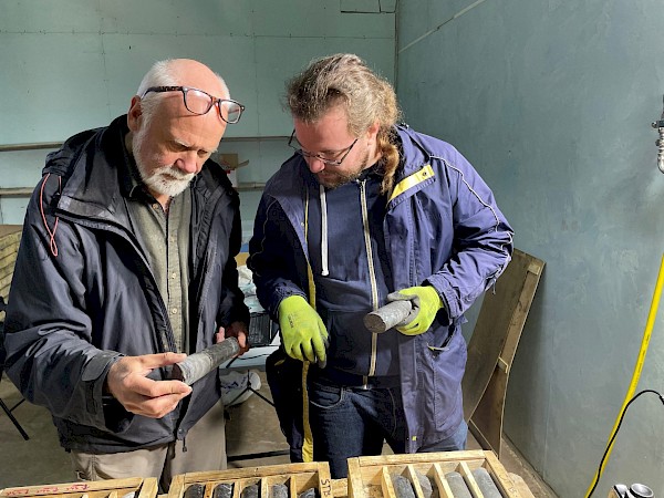 Geologists Kjell Nilsen and Jonas Dombrowski examining drillcore