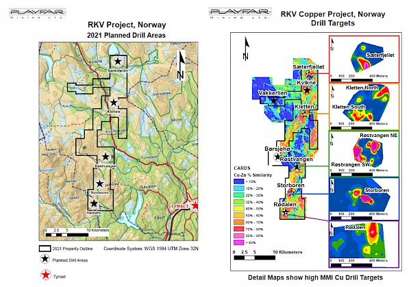 Playfair’s extensive drill program on its large (201 square kilometers) 100% RKV Copper Project in South Central Norway has successfully completed seven short holes totaling 385.1 metres to test the Storboren target identified by using a combination of Artificial Intelligence (CARDS) and Mobile Metal Ion (MMI) geochemistry. Drilling at Rødalen was reported in Playfair’s October 8, 2021 News Release.